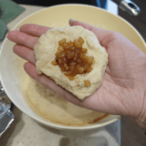 Из теста сформировать небольшую лепешку и выложить в центр начинку, сформировать пирожок.
