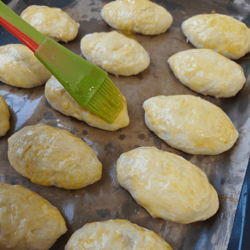На противень выложить пергамент, смазанный растительным маслом. Затем выложить пирожки швом вниз и сверху смазать яичным желтком. Духовой шкаф разогреть до 180 градусов и выпекать пирожки 20–25 минут до образования румяной корочки.
