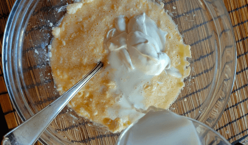 В полученное тесто добавить разрыхлитель и перемешать.