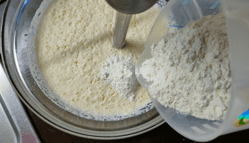 Перемешивать миксером, постепенно добавляя муку.