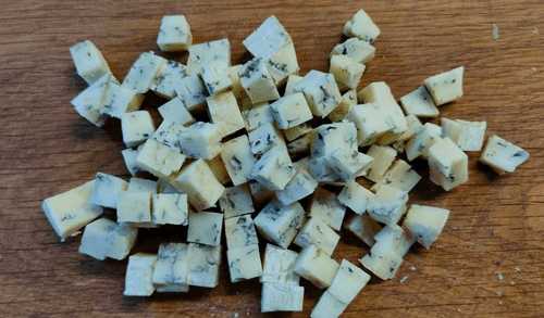 Из холодильника достать сыр и нарезать его кубиками (не мелко).