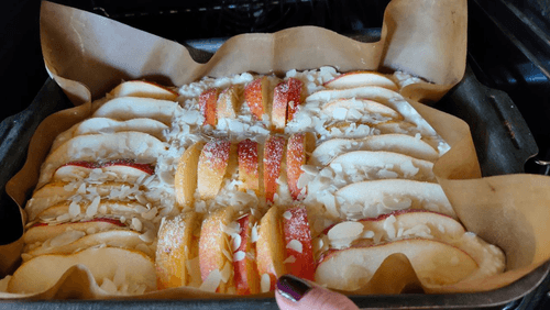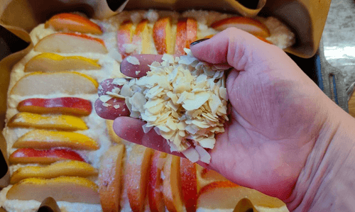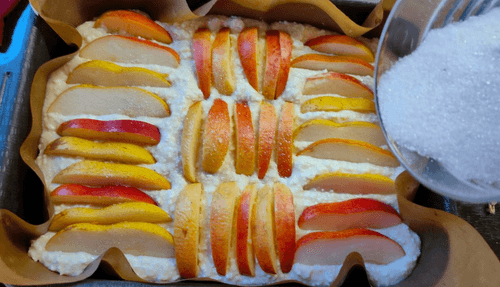 Дольки фруктов выложить в произвольном порядке, слегка утопив их в массу. Сверху присыпать сахаром для карамельной корочки (буквально 2 ложки).