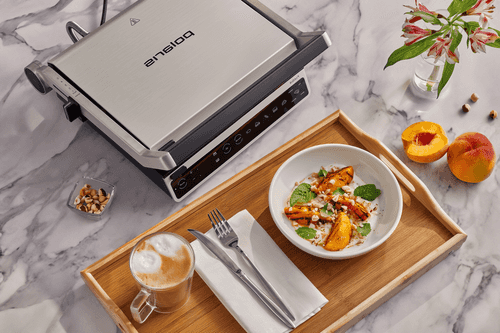 Персики выложить на гриль и обжарить их до красивого узора с обеих сторон.