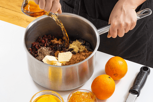 Сложить в сотейник сухофрукты, коньяк, сливочное масло, джем, мед, сок и цедру 2 апельсинов, пряности и какао.