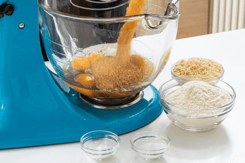 Яйца взбить с коричневым сахаром, обоими видами муки, разрыхлителем и солью.