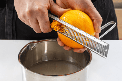 Снять цедру с оставшегося апельсина мелкой теркой. Смешать в сотейнике с белым сахаром и 100 мл воды.