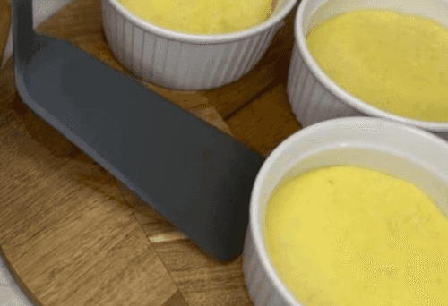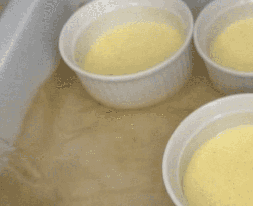 Разлить по формочкам крем, после чего налить 1/4 кипятка в форму. На дно формы постелить пергаментную бумагу, чтобы капли воды не попадали в крем. Если капля кипятка попадет, желтки свернутся.