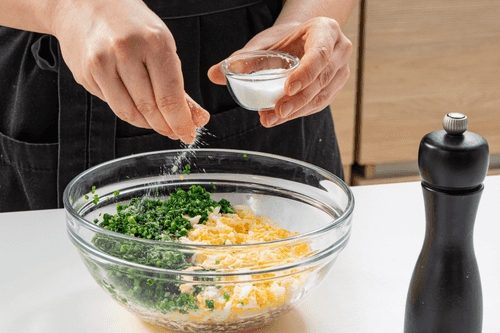 Смешать лук с яйцами, посолить и поперчить по вкусу.