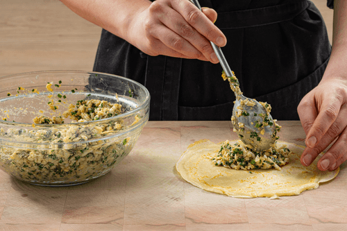 Завернуть начинку с луком и яйцом в блины.