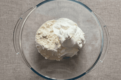 Добавить к тесту сметану с кокосовой мукой и тщательно перемешать.