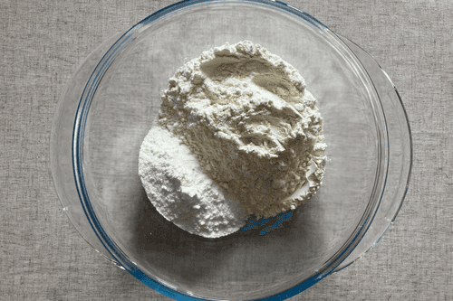 В отдельной кастрюле смешать пшеничную и рисовую муку.