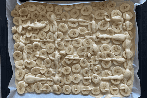 Выложить на тесто бананы и добавить немного теста.