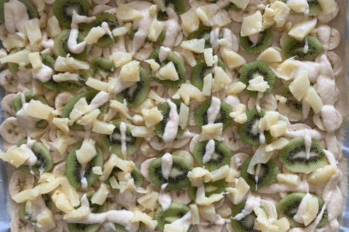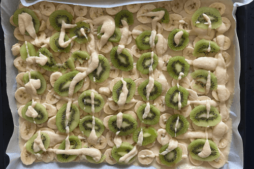 Выложить на тесто киви и добавить немного теста.