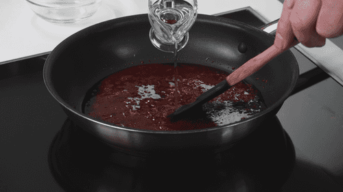 Как только сахар растает, влить в сковороду воду (очень осторожно), перемешать и уваривать сироп 2 минуты до состояния карамели.