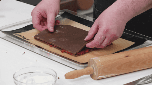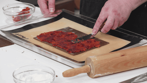 Поверх таким же слоем выложить начинку. В ресторанном варианте это смесь тыквенного сухого варенья, смешанного с размолотой вяленой клюквой, но можно использовать любой густой джем, перемолотые цукаты или повидло.