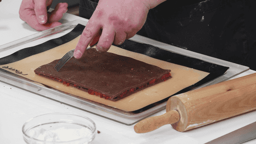 Точно так же раскатать вторую половину теста, подровнять ножом края, выложить поверх начинки и аккуратно, не выдавливая начинку, примять, чтобы слои лучше слепились друг с другом.