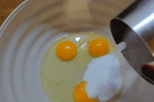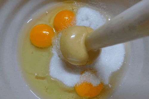 С помощью блендера (или венчика) взбить яйца с сахаром.