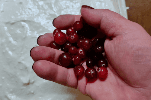 На ровную поверхность запеканки высыпать горсть клюквы.