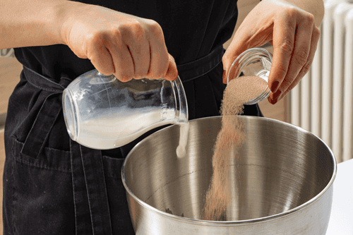 В чаше миксера смешать 75 грамм муки, 3 грамма дрожжей и молоко до однородной массы. Накрыть и оставить в теплом месте на 4 часа. Опара должна подняться и начать пузыриться.