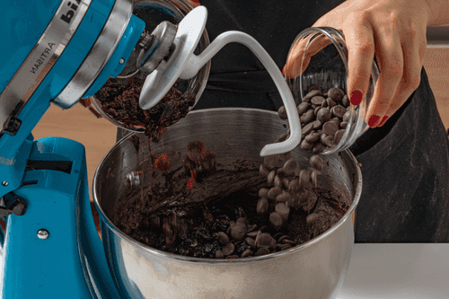 Добавить замоченную вишню и шоколадные капли (вместо них можно использовать нарезанную небольшими кубиками плитку шоколада). Перемешать.