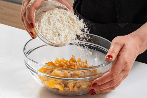 В миске смешать изюм и цукаты и засыпать небольшим количеством муки. Перемешать и избавиться от лишней муки, просеяв смесь через сито.