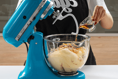 Вмешать в тесто насадкой крюк изюм, цукаты и коньяк.