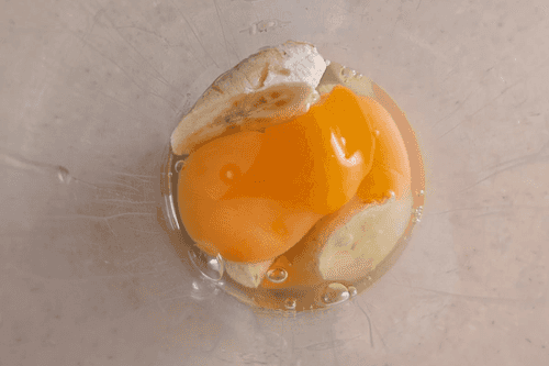 В миску для блендера сложить банан и разбить 2 яйца.