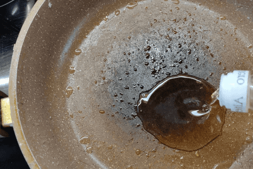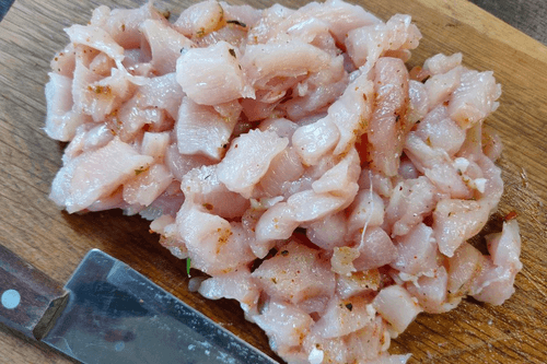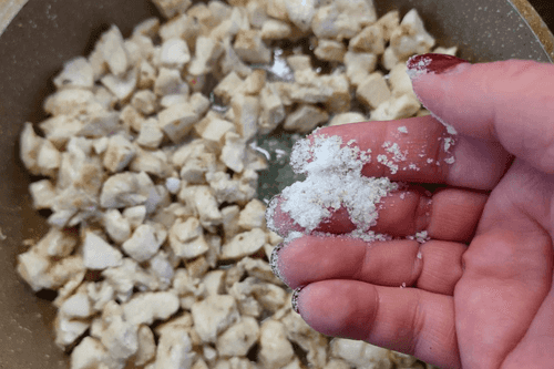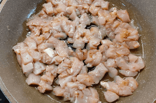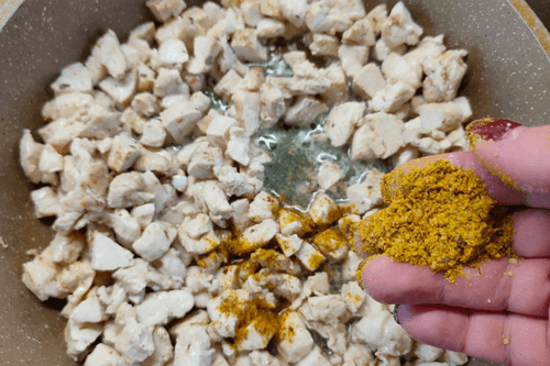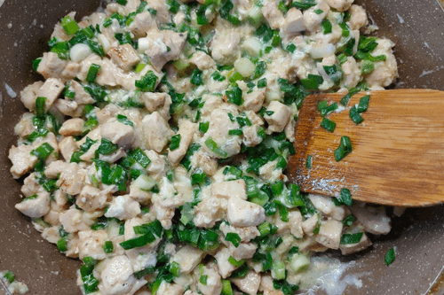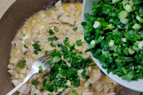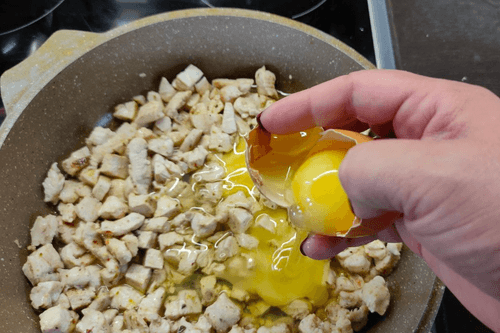 В сковороду с курицей разбить 4 яйца и перемешать.