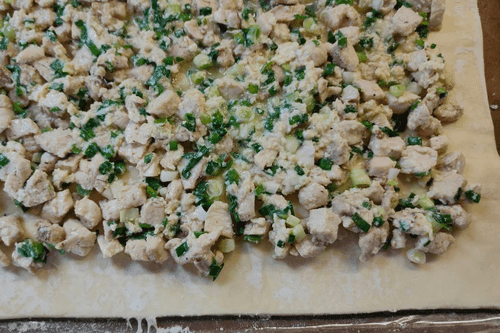 Начинку распределить по поверхности, уложив таким образом, чтобы с одной стороны остался не покрытый кусок теста.