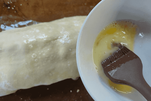 Яйцо разбить в мисочку, взболтать и получившейся смесью смазать рулет при помощи кисточки.