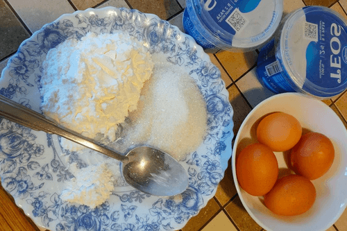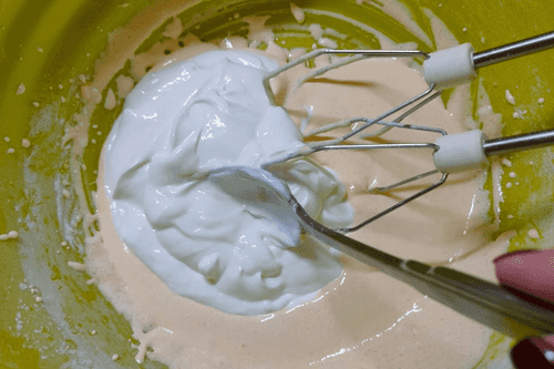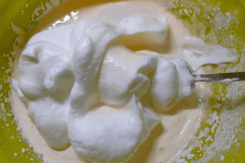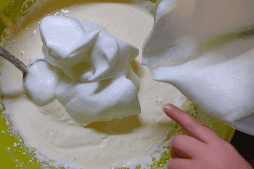 Аккуратно переложить белковую пену к смеси желтков, йогурта и крахмала с сахаром.