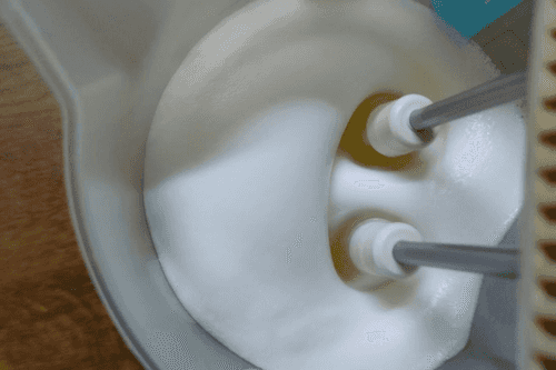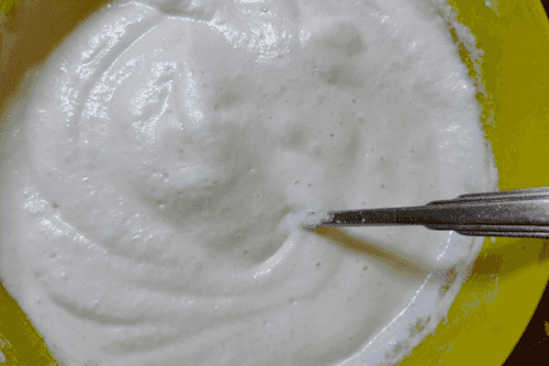 Взбивать несколько минут до получения белой густой пены — это называется состояние пиков, когда масса не выпадает из перевернутой емкости.