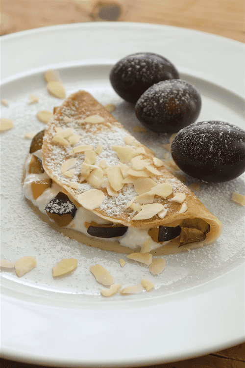 Блинчики с сыром и сливой — утонченное сочетание воздушного теста, нежного сливочного сыра и ароматной сливы. Этот рецепт черпает вдохновение из традиционной русской кухни, где блины издревле служили символом солнца и праздника. Тонкие золотистые блины с мягким сыром и сладковато-пряными сливами, пропитанными медом, лимонным соком и корицей, создают восхитительный баланс вкусов. Их можно подать как изысканный завтрак или легкий десерт, украсив сахарной пудрой и орехами. Такой рецепт идеально подходит для уютных семейных вечеров, а также способен украсить праздничный стол. Тонкость теста, кремовая начинка и фруктовая кислинка превращают обычные блины в настоящее гастрономическое удовольствие.
