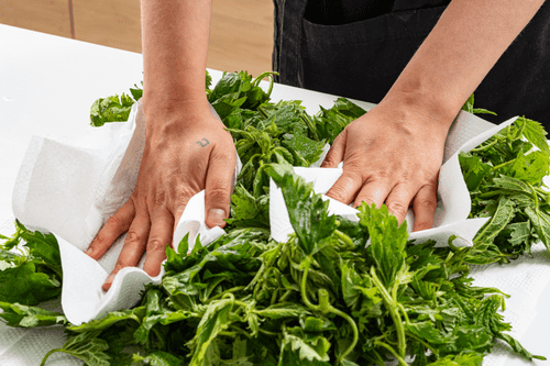 Крапиву помыть и обсушить на бумажных полотенцах.