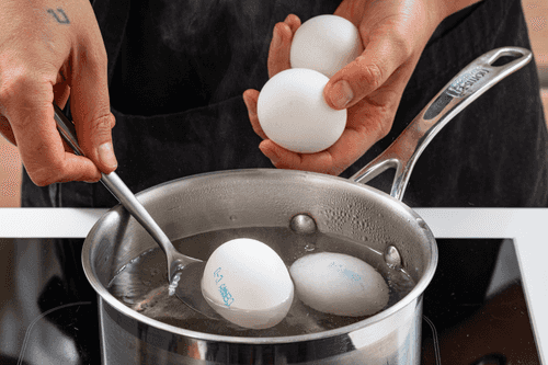 В сотейнике вскипятить воду. Аккуратно положить в воду яйца и варить 10 минут.