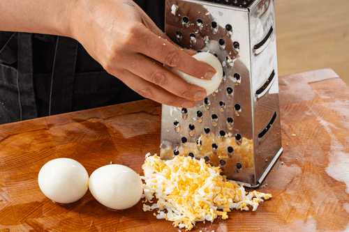 Когда яйца сварятся, охладить их под холодной водой, очистить и натереть на терке.