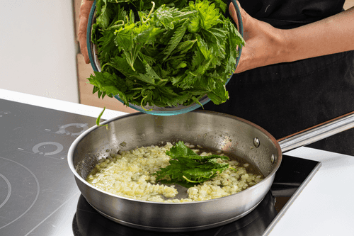 В сковороде растопить сливочное масло. Обжарить лук до прозрачности, добавить крапиву и тушить 1–2 минуты.