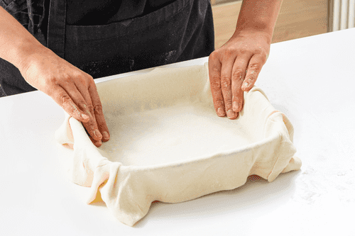 Раскатать оба пласта теста под размер формы для выпекания. Смазать форму для выпекания сливочным маслом и выложить один пласт теста.