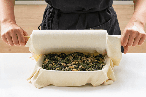 На тесто выложить начинку, накрыть вторым пластом теста и скрепить края.