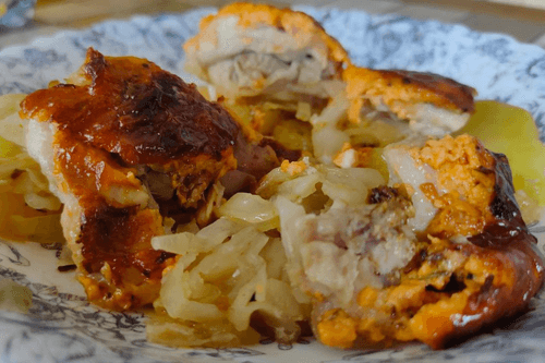Выложить сверху на лук и картофель.