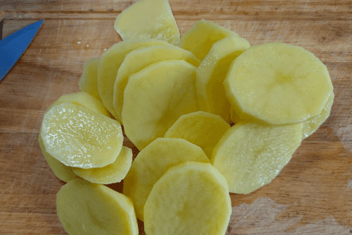 Картофель нарезать кружочками толщиной не более 5 мм.