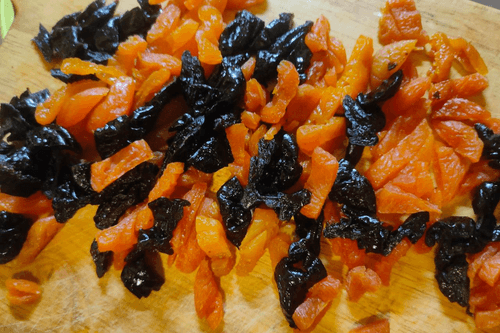 Курагу и чернослив помыть (если требуется) и нарезать.