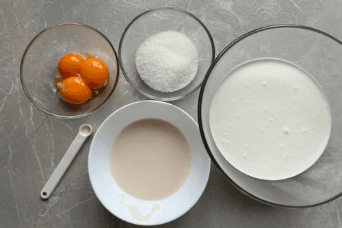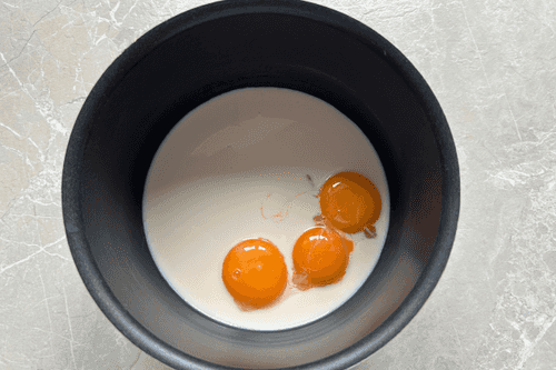 В кастрюлю отправить молоко, желтки, сахар, ванилин.