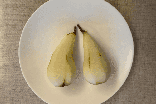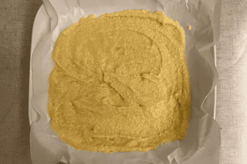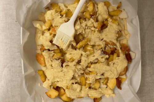 Выложить на тесто груши и нанести немного теста сверху. Равномерно распределить кистью.