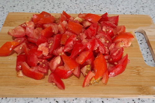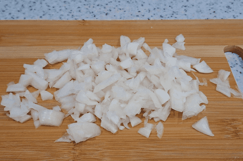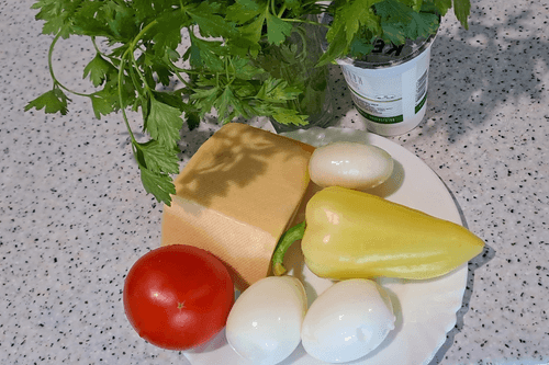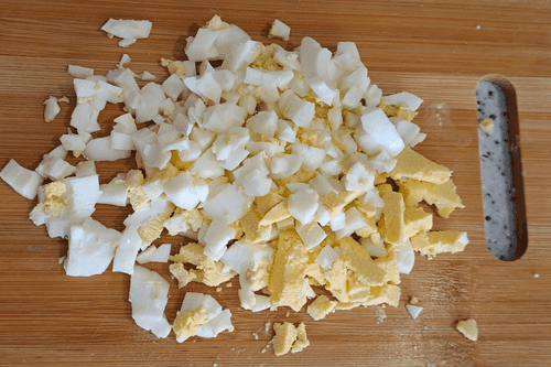 2 яйца отварить в течение 10 минут, очистить и затем нарезать мелкими кубиками.
