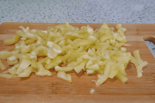 Выложить на тесто нарезанные ранее ингредиенты и равномерно их распределить.
