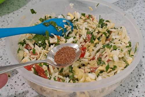 К нарезанным ранее ингредиентам добавить 5 грамм смеси перцев и 10 грамм соли. Все хорошо перемешать.