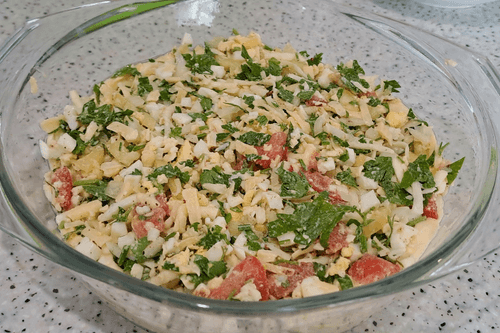 Моцареллу также натереть на крупной терке, примерно 20 грамм отложить в отдельную емкость, а 30 грамм добавить к остальным нарезанным ранее ингредиентам.