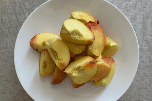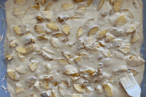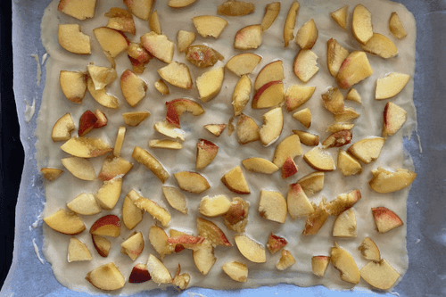 Застелить противень пергаментом, выложить немного теста и положить на него персики.