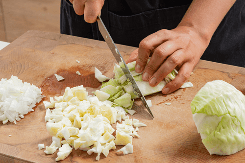 Яйца очистить и нарезать при помощи яйцерезки или ножа. Добавить яйца к готовой капусте, попробовать и при необходимости досолить. Дать начинке остыть.